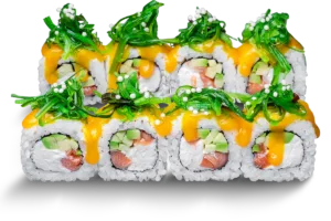 Суші-бургер з копченим лососем – це справжня знахідка для поціновувачів японської кухні. Соковитий копчений лосось, ніжний крем-сир, червона ікра масаго, свіжий огірок і зелена цибуля створюють витончений смак, який гармонійно доповнюється хрусткою темпурою. Основу бургера складають м’який рис і норі, що забезпечують легкість кожного шматочка.