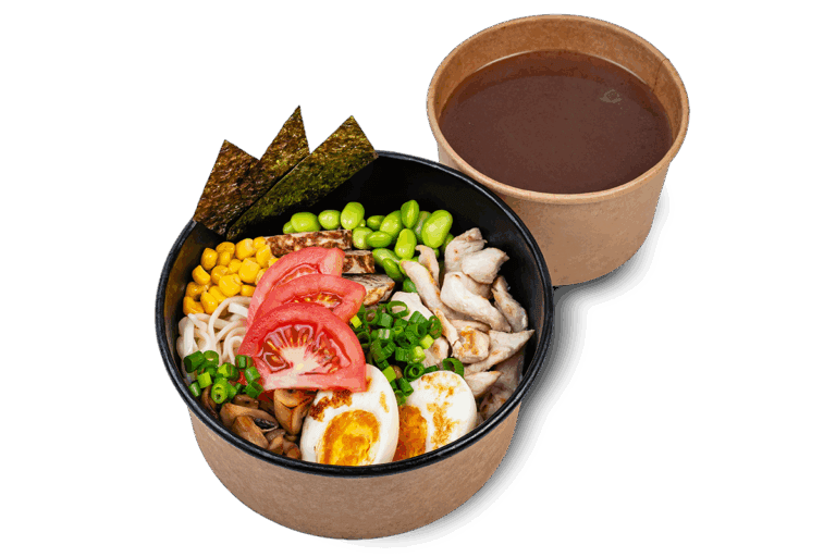 Склад: Бульйон рамен, локшина удон, куряче яйце, кукурудза, боби едамаме, куряче філе, печериці, помідор, японський омлет, цибуля зелена перо, норі